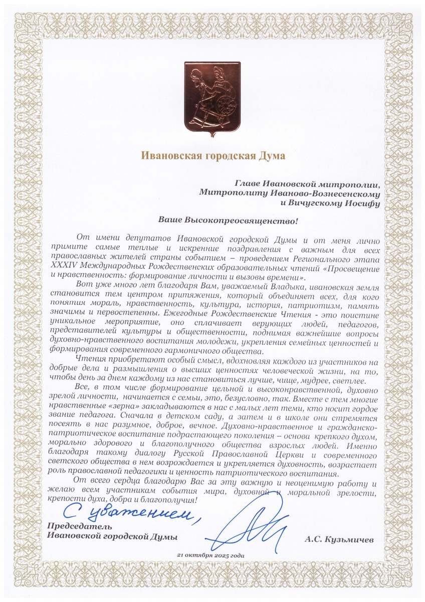 21.10. Приветствие председателя Ивановской городской Думы А.С. Кузьмичева участникам Регионального этапа XXXIV Международных Рождественских образовательных чтений